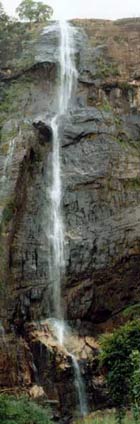 Diyaluma Falls, the "Fall of Smoking Water" at 212 metres is the second tallest waterfall in Sri Lanka and the sixth tallest in the world. The Diyaluma or Diya Haluma collects its water from the Poonagala Oya in the vicinity of Koslanda and Wellawaya. Located six miles from Koslanda and 13 miles from Wellawaya, its waters originate from the Mahakande Pass in Koslanda. With an appearance and location which often make people believe that it is the highest waterfall in the isle, this lanky "Diyaluma" waterfall pours its way down and flows towards Kirindi Oya underneath a bridge on the highway from Beragala to Wellawaya. The extent of water spilt downwards is so great during the rainy season that it makes amends for the monotonously undisturbed water trunk falling from head to foot with no intermediate cascade whatsoever. Its geographical location by one of the mostly used highways spanning the Hill Country to the plains speaks for its reputation not only here but in other parts of the world as well. You can see this waterfall if you go just two kilometers from Koslanda on the road to Wellawaya. |